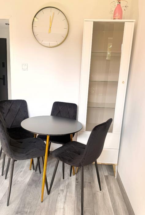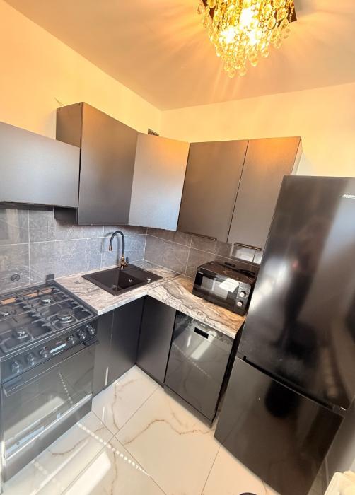 ✔ kuchnia wyposażona w nowoczesne czarne meble, lodówkę, zmywarkę i kuchenkę z piekarnikiem