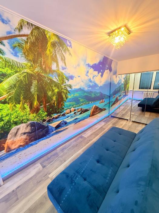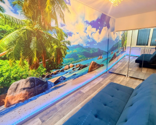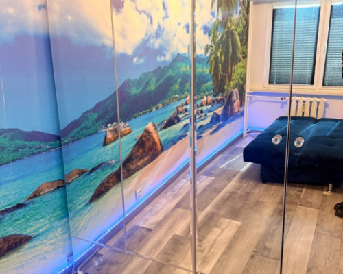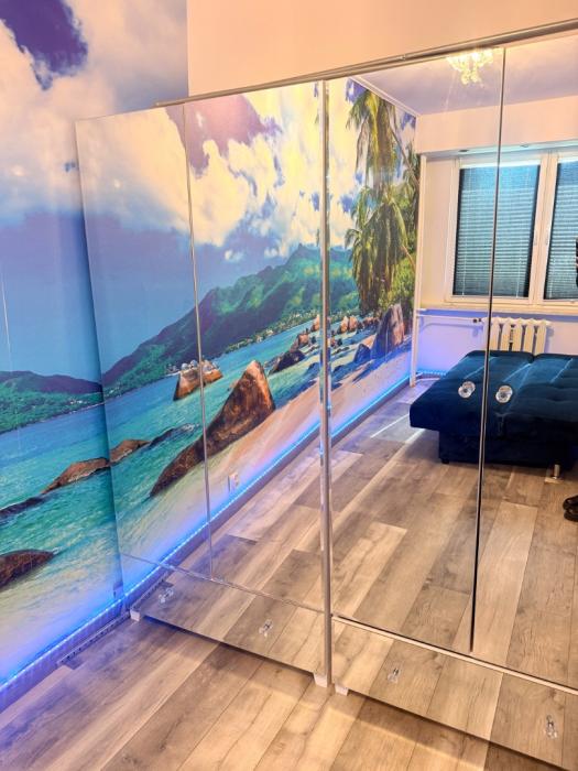 ✔ przytulna sypialnia z piękną fototapetą oraz pojemnymi szafami z lustrami